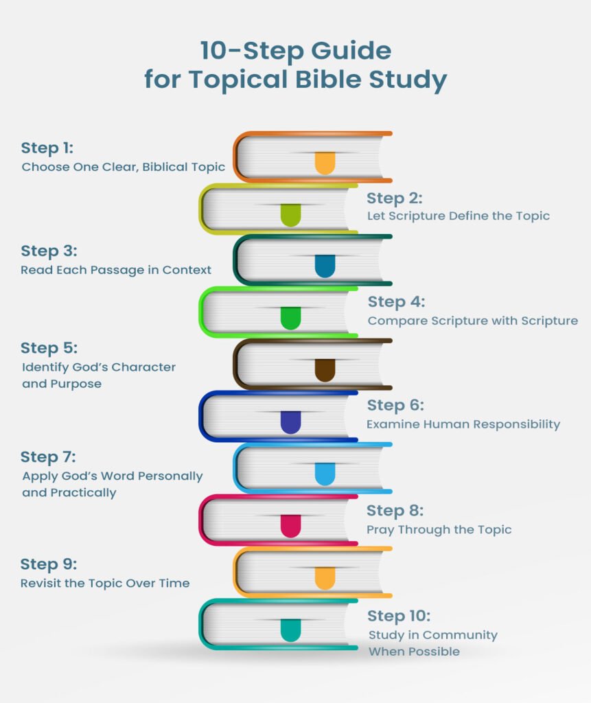 This structured approach helps believers study Scripture with clarity, faithfulness, and purpose. By letting God’s Word lead every step, topical study becomes a pathway to spiritual maturity, obedience, and lasting growth.